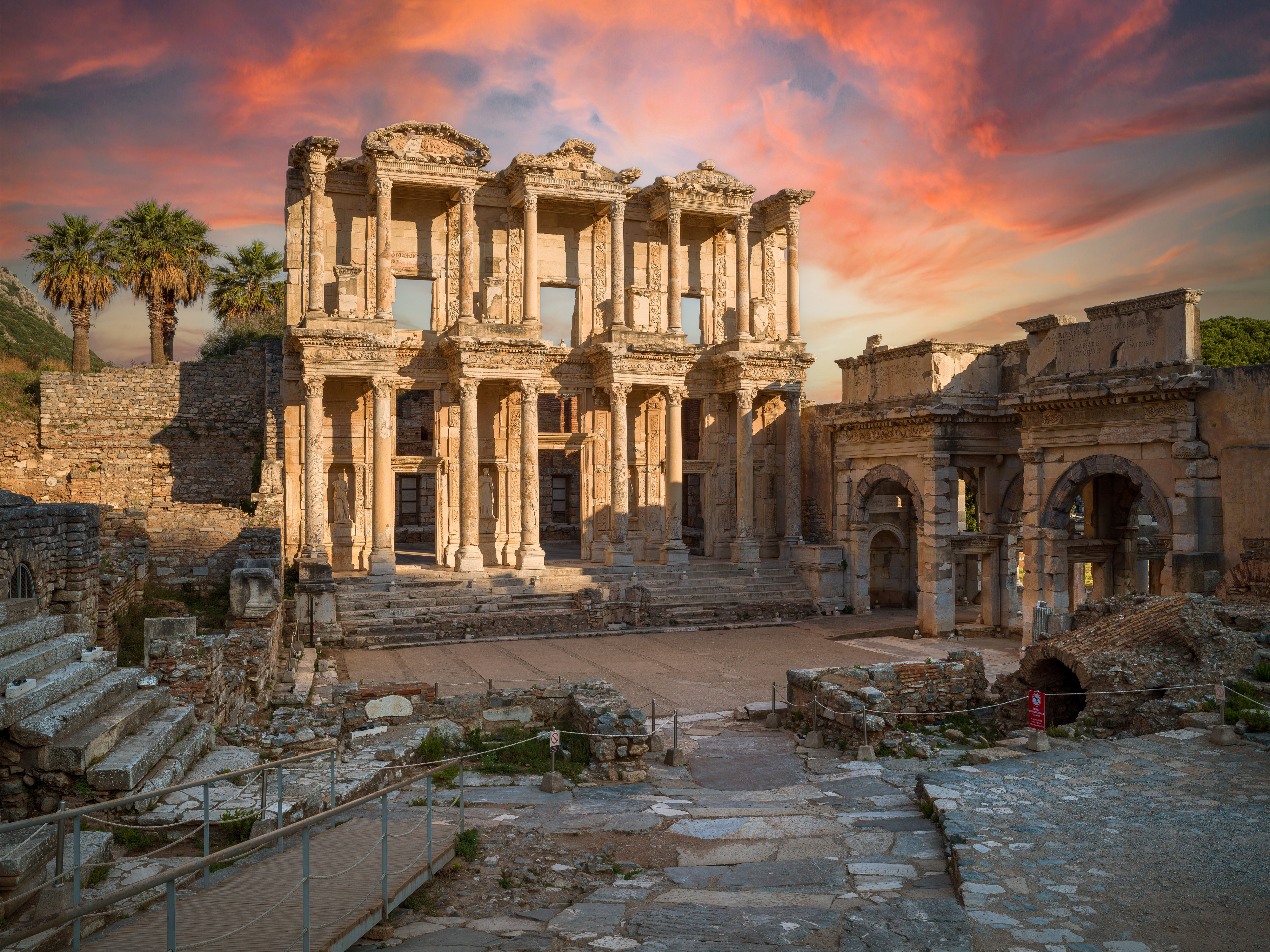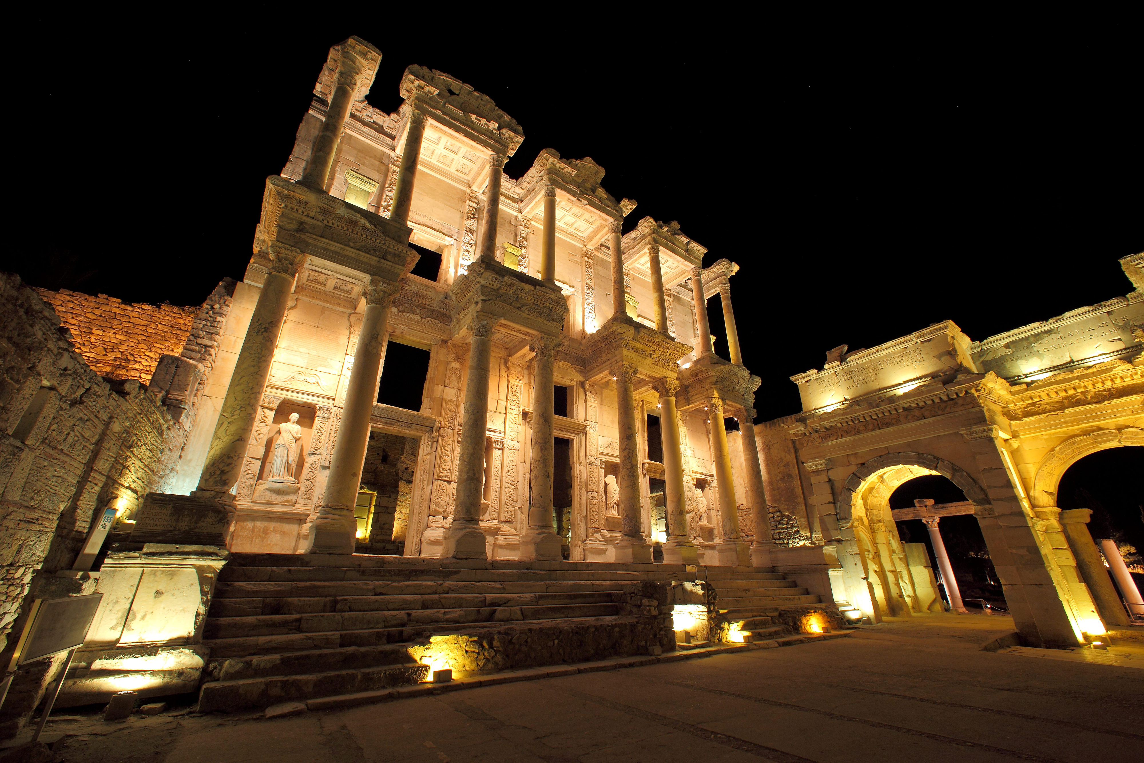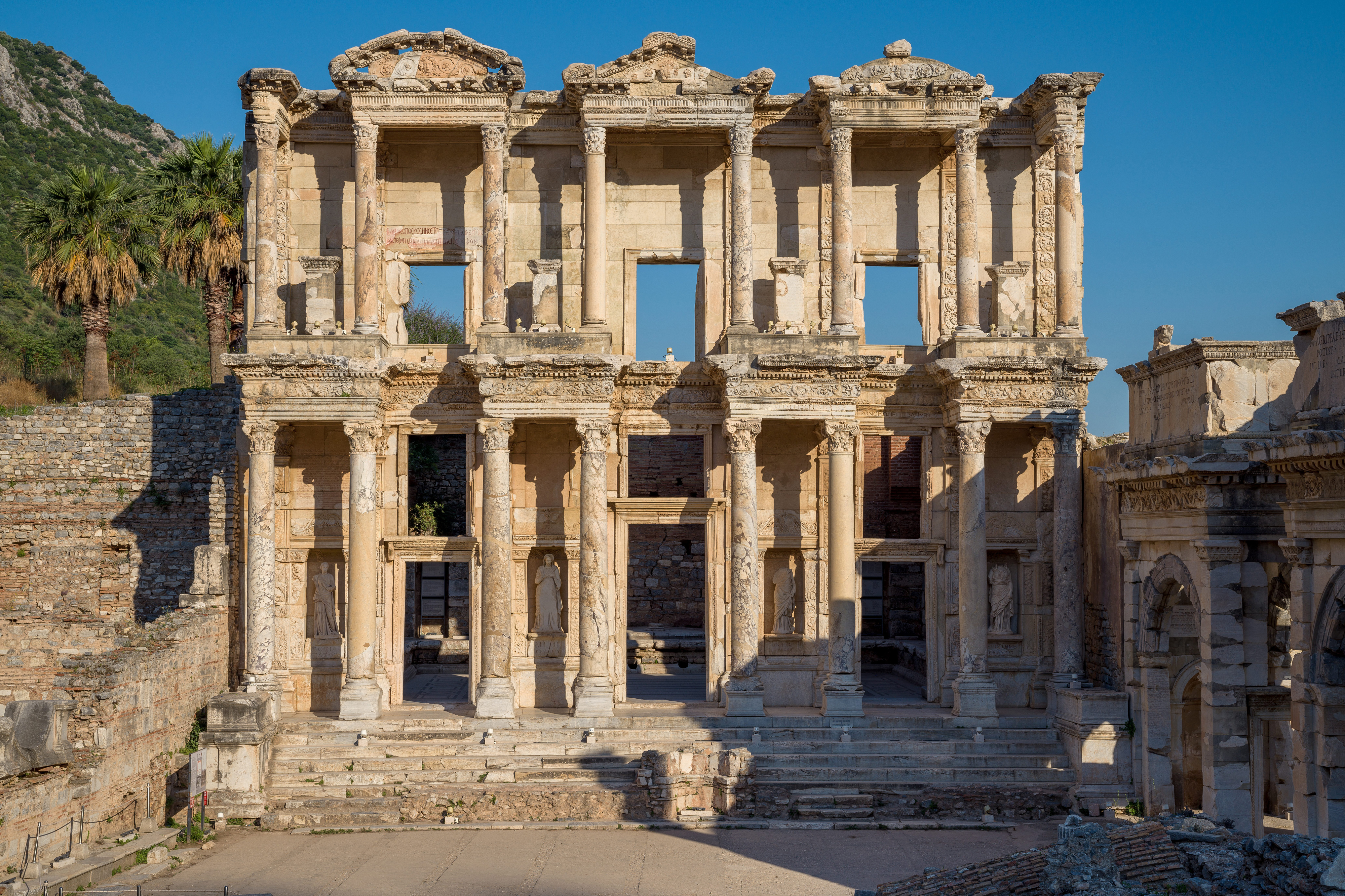 The Celsus Library was once located in the centre of the ancient metropolis of Ephesos and bordered the south gate of the Tetragonos Agora, the trading market of the time. The two-storey library façade was made of marble and is 21 metres wide and over 16 metres high. An optical widening of the façade (illusory perspective) was achieved by the curvature of the horizontal structural elements and the consistent elevation of the vertical structural elements towards the centre axis.